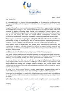 List Dmytra Kuleby - Ministra Spraw Zagranicznych Ukrainy - do polskich przedsiębiorców