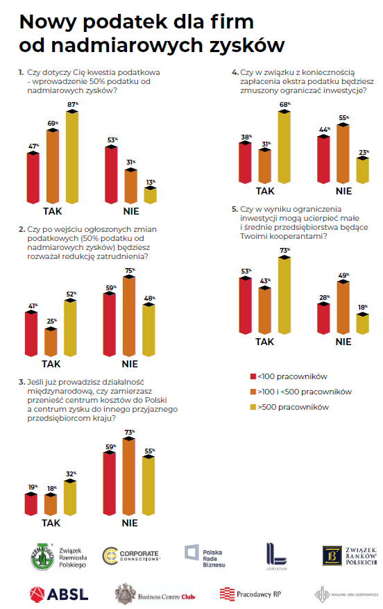 W ubiegłym tygodniu Rada Przedsiębiorczości przeprowadziła badanie na przedstawicielach 146 największych firm w Polsce. Badanie było odpowiedzią na zapowiadane przez rząd wprowadzenie 50 proc. podatku od „zysków nadzwyczajnych”.