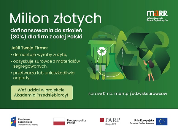 Dla przedsiębiorców, którzy zajmują się odzyskiem surowców z materiałów segregowanych, demontażem wyrobów zużytych, zbieraniem, przetwarzaniem i unieszkodliwianiem odpadów niebezpiecznych i innych niż niebezpieczne – dostępne są jeszcze środki w kwocie ponad 1 miliona złotych na dofinansowanie do szkoleń pracowników.