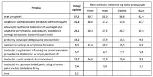 - GUS podał również szczegółowe dane pokazujące, jak oceniane są warunki świadczenia usług w UE w zależności od wielkości przedsiębiorstwa oraz branży. Z badań wynika, że funkcjonowanie na rynku usług transgranicznych najlepiej oceniają duże przedsiębiorstwa oraz mikrofirmy. Brak utrudnień wskazało 61,4% dużych oraz 60,7% mikrofirm. W przypadku małych i średnich brak utrudnień deklarowało odpowiednio 53,0% oraz 56,8% ankietowanych. Dla wszystkich firm, niezależnie od ich wielkości największy problem stanowią dodatkowe wymagania stawiane polskim usługodawcom – szczególnie odnotowują je firmy małe (27,5%) i średnie (25,7%).