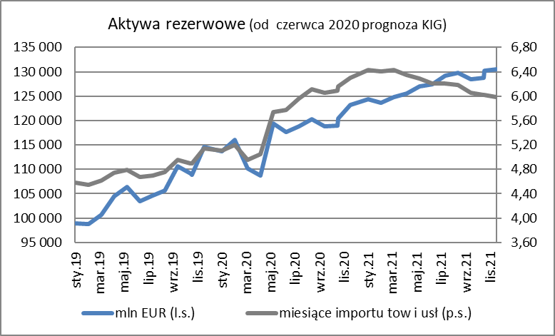 Rezerwy w końcu maja pozwoliłyby na sfinansowanie 5,74 miesiąca importu towarów i usług (po kwietniu 5,05%), 31,1% podaży pieniądza (po kwietniu 29,5%) oraz 36,8% całości zadłużenia zagranicznego (po kwietniu 36,0%). Wszystkie z wymienionych wskaźników utrzymują się też na dobrych poziomach. Oznacza to, iż jest niskie ryzyko pojawienia się u nas głębokiej utraty wartości przez złotego.