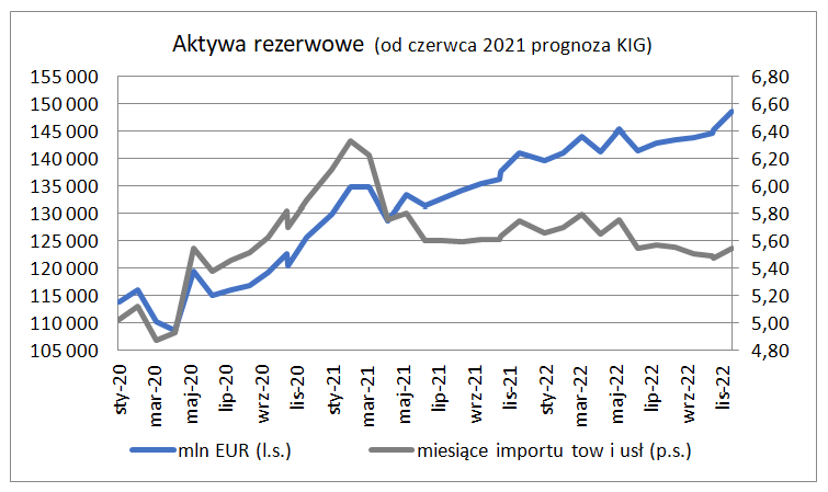 Prognozowany dla końca roku 2021 stan rezerw walutowych to 140 977 mln EUR, wyższy niż w końcu 2020 o 12,2%. Rezerwy powinny wtedy pokrywać 5,74 miesiąca importu towarów i usług, 30,6% podaży pieniądza oraz 46,4% zadłużenia zagranicznego.