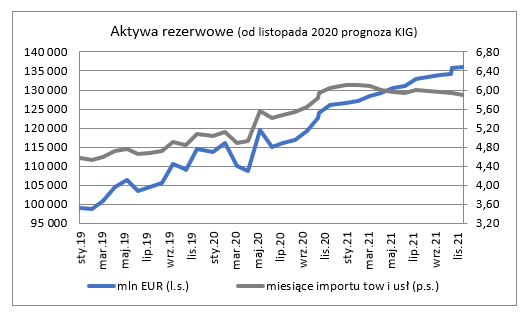 Rezerwy w końcu października pozwoliłyby na sfinansowanie 5,84 miesiąca importu towarów i usług (po wrześniu 5,65%), 31,9% podaży pieniądza (po wrześniu 30,6%) oraz 39,9% całości zadłużenia zagranicznego (po wrześniu 39,5%). Wszystkie z wymienionych wskaźników utrzymują się też na dobrych poziomach. Oznacza to, iż jest niskie ryzyko pojawienia się u nas głębokiej utraty wartości przez złotego.