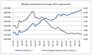 Prognozowany aktualnie stan rezerw walutowych dla końca roku 2023 to 166 484 mln EUR, wyższy niż w końcu 2022 o 6,4%. Rezerwy powinny wtedy pokrywać 4,48 miesiąca importu towarów i usług, 33,9% podaży pieniądza oraz 48,5% zadłużenia zagranicznego.