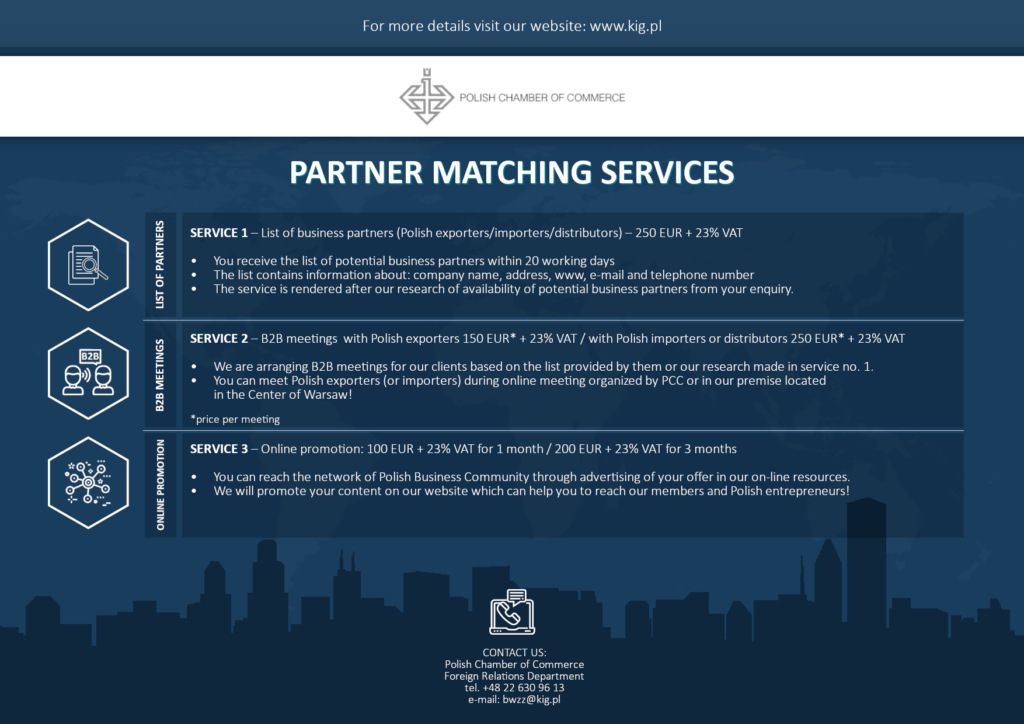 Krajowa Izba Gospodarcza od 1990 roku zajmuje się wspieraniem polskich przedsiębiorców. Wśród licznych działań Biura Współpracy z Zagranicą KIG znajduje się między innymi usługa kojarzenia partnerów. Polega ona na przygotowaniu (w oparciu o przeprowadzone przez nas badanie rynku i Twoją ofertę) wyselekcjonowanej listy partnerów zagranicznych spełniających zadane przez Ciebie kryteria.