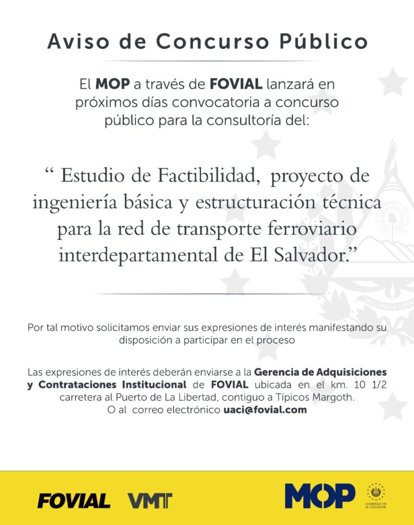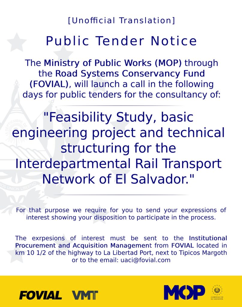 Przetarg na doradztwo w zakresie „Studium wykonalności, podstaw projektu inżynierskiego i struktury technicznej dla Międzyresortowej Sieci Transportu Kolejowego El. Salvador.”