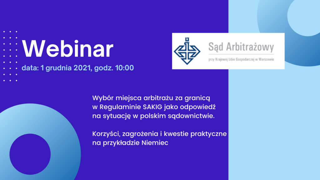 Webinar: Wybór miejsca arbitrażu za granicą w Regulaminie SAKIG jako odpowiedź na sytuację w polskim sądownictwie. Korzyści, zagrożenia i kwestie praktyczne na przykładzie Niemiec