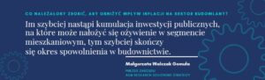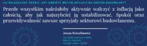 Podsumowując, można stwierdzić, że drastyczny wzrost kosztów, wstrzymywanie się z decyzjami inwestycyjnymi, rosnące obawy o spowolnienie na rynku to tylko kilka z długiej listy wskazanych przez przedstawicieli sektora budowlanego problemów wywołanych inflacją. Każdy z nich jest poważny i stanowi istotne zagrożenie dla funkcjonowania sektora, ale jednym z najbardziej niepokojących jest przywoływany w wielu wypowiedziach brak stabilności. Przewidywalność i stabilizacja są pożądane w każdej działalności biznesowej, a w przypadku budownictwa, w którym większość inicjatyw należy planować i przygotowywać w perspektywie długofalowej, są to wartości fundamentalne. Dlatego też, obok wprowadzania zaproponowanych w wypowiedziach ekspertów instrumentów (np. preferencyjnych kredytów czy szerokiego uruchomienia inwestycji finansowanych z udziałem środków UE), priorytetowym działaniem w walce z inflacją powinno być przywrócenie poczucia stabilności na rynku. Prognozy wskazują na szczęście, że dynamika wzrostu cen w tym roku powinna spadać. Nie oznacza to jednak, że równie szybko spadać będzie poczucie niepewności i nieprzewidywalności na rynku budowlanym. Wszyscy zdajemy sobie sprawę, że czynniki powodujące inflację w dużej mierze mają swoje źródła na zewnątrz. Na niektóre z nich, jak wojna w Ukrainie, nie mamy większego wpływu, ale istnieje wiele obszarów, na które instytucje państwowe mogą mieć wpływ i w których można podjąć wiele działań łagodzących skutki inflacji dla sektora budowlanego. Przykładem może być m.in. upraszczanie przepisów regulujących proces inwestycyjny czy też szersze włączenie przedsiębiorstw z branży do programów dla biznesu łagodzących skutki wzrostu cen. Sektor budowlany jest filarem gospodarki – im sprawniej poradzi sobie ze skutkami inflacji, tym szybciej cała gospodarka powróci na drogę wzrostu.