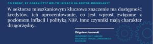 i podwykonawcami, jest całkowicie poza kontrolą. Udało się jedynie trochę uporządkować proces zamówień publicznych, ale i tutaj jest sporo do zrobienia. Należy się wreszcie zająć stabilnością zatrudnienia w budownictwie, szczególnie wykwalifikowanych pracowników. Po pierwsze większość pracowników powinna być zatrudniona na umowy o pracę, bo to wynika z zapisów kodeksowych i charakteru tej pracy. Po drugie partnerzy społeczni (być może z udziałem właściwej administracji rządowej) powinni zająć się problemem adekwatności wynagrodzeń do poziomu posiadanych kwalifikacji. Od 30 lat branża narzeka na niedobór wykwalifikowanych pracowników, a to wynika przecież z braku korelacji pomiędzy poziomem kwalifikacji a poziomem wynagrodzenia, braku stabilności zatrudnienia, z tzw. śmieciowych umów i dumpingu nieuczciwych firm na rynku. Przez ten czas nie zrobiliśmy prawie nic w tej sprawie, a wciąż narzekamy na brak kadr oraz na szkoły, które kształcą za mało pracowników i nie w sposób, jaki by chcieli pracodawcy. Prawda jest jednak taka, że praca w branży budowlanej w Polsce jest z wymienionych względów nieatrakcyjna dla młodych ludzi. W kontekście inflacji i jej wpływu na sektor kluczowe znaczenie będzie miało ograniczenie kosztów produkcji i usług, w tym przede wszystkim wzrostu kosztów energii. Branża budowlana nie jest tutaj objęta jakimkolwiek programem wsparcia. Segment produkcji wyrobów próbował uzyskać takie wsparcie, ale nic dotychczas nie wskórał, choć jest bez wątpienia sektorem energochłonnym. Czy da się coś więcej w tej sprawie zrobić? Pewnie liczy się siła przebicia, a ona w przypadku budownictwa jest nikła z uwagi na atomizację i brak prawdziwej systemowej współpracy różnych reprezentacji tej branży. W sektorze mieszkaniowym kluczowe znaczenie ma dostępność kredytów, ich oprocentowanie, co jest wprost związane z poziomem inflacji i polityką NBP. Inne czynniki mają charakter drugorzędny.