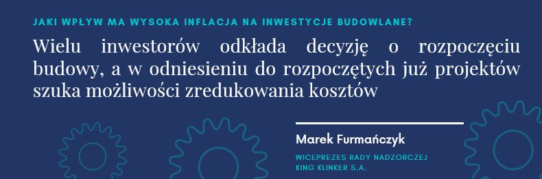 Początkowo strach inwestorów przed rosnącą inflacją stymulował rynek inwestycyjny. Jednak obecnie ze względu na wzrost cen materiałów i usług budowlanych można zaobserwować wyhamowanie tej tendencji. Wielu inwestorów odkłada decyzję o rozpoczęciu budowy, a w odniesieniu do rozpoczętych już projektów szuka możliwości zredukowania kosztów. Bez wątpienia większość zawartych wcześniej kontraktów wymaga urealnienia ich wartości.