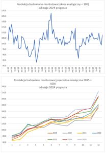 Według statystyk oczyszczonych z wpływu czynników o charakterze sezonowym, produkcja budowlano-montażowa w kwietniu 2024 r. była niższa o 5,8% niż przed rokiem oraz wyższa o 2,3% w porównaniu z poprzednim miesiącem.