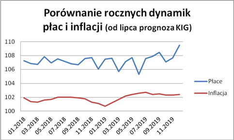 Roczna dynamika płac do końca roku powinna oscylować w granicach 7,5%-8,0%, a średnioroczny wzrost płac wyniesie 7,4%. Oczekujemy, że średnia płaca w grudniu 2019 r. wyniesie 5776 PLN i będzie o 9,5% wyższa, niż przed rokiem.